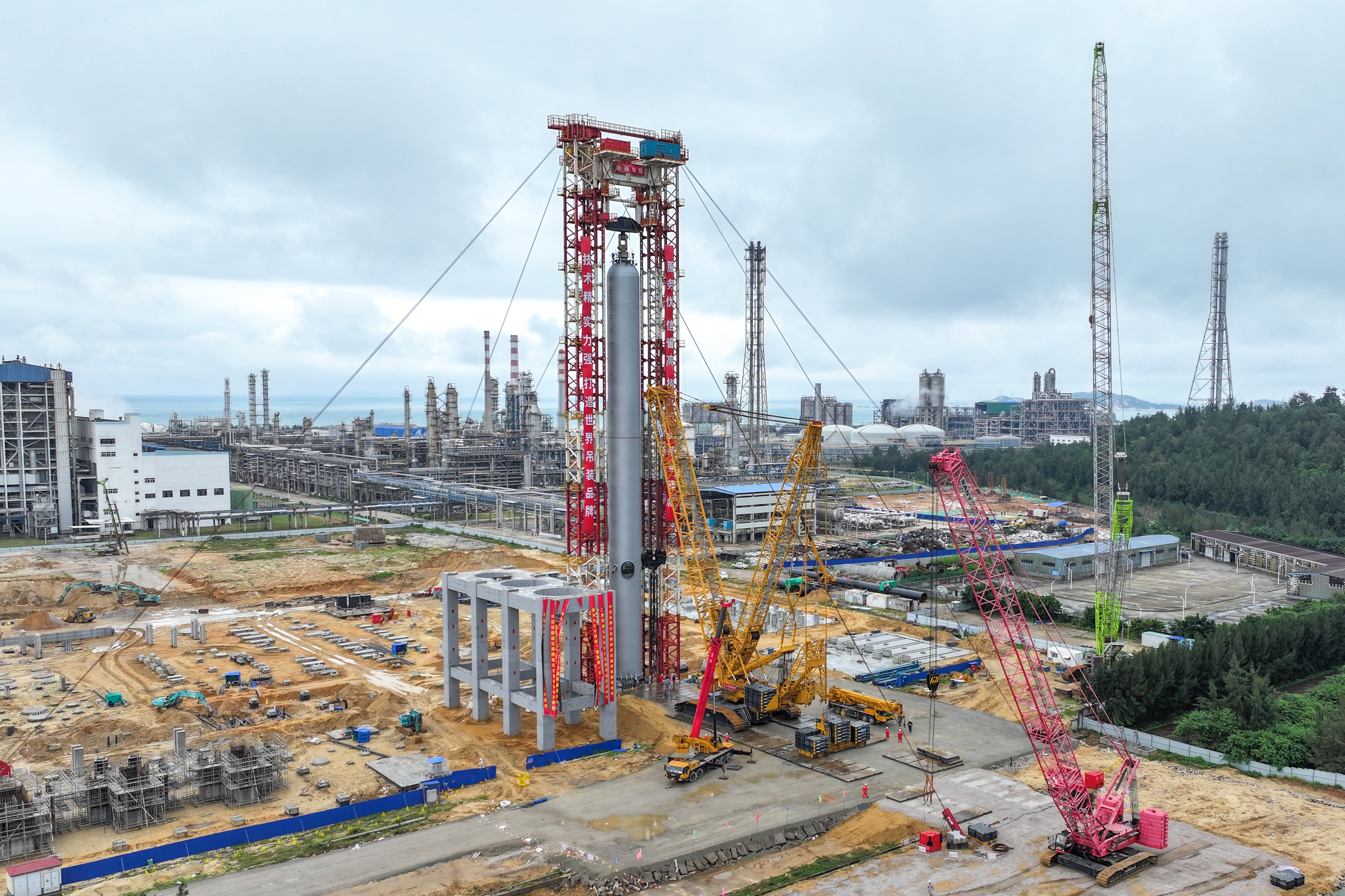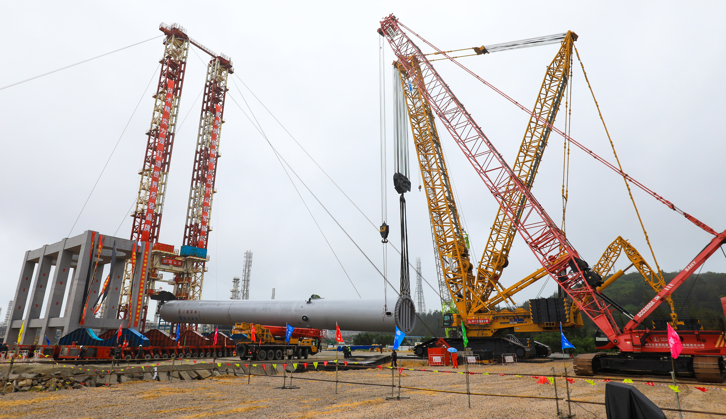 R-102加氢反应器长72.91米,直径5.43米,净重2300吨,是目前福建省内吊装的最重整体设备。为圆满完成此次吊装任务,福海创项目团队和广州院项目团队加班加点、通力协作、反复论证,克服种种困难,历时4个多月的前期准备,为这个“大块头”的顺利吊装扫除障碍。