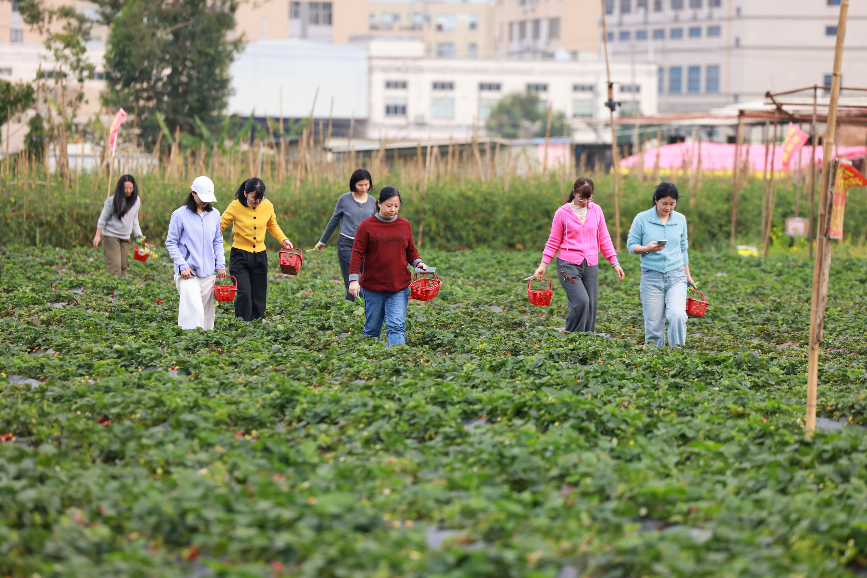 走进草莓采摘园,翠绿藤蔓间红果点缀、果香四溢。女职工们结伴穿梭田垄,边采摘新鲜草莓,边分享工作生活趣事,欢声笑语满园,在亲近自然中卸下疲惫,感受着春日里的鲜活与美好。